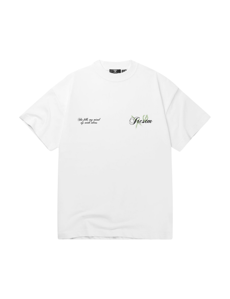 Laat je streetwear look spreken met de Angel Loose Fit T-Shirt van JorCustom in White/Sage Green. Deze eyecatcher combineert een relaxed silhouet met een iconische illustratie van een engel, voorzien van subtiele groene accenten en de opvallende quote: “She fills my mind up with ideas.”