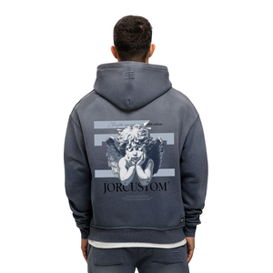 Deze oversized hoodie heeft een opvallend sunfade effect dat van donker naar lichter blauw verloopt. De capuchon zorgt voor extra comfort en de ruime kangoozak aan de voorkant biedt praktische opbergruimte. Op de achterkant staat een engelenprint met tekst en het JorCustom logo. De ribboorden bij de mouwen en zoom geven de trui een nette afwerking. Het relaxte oversized silhouet draagt comfortabel en geeft je look direct meer karakter.