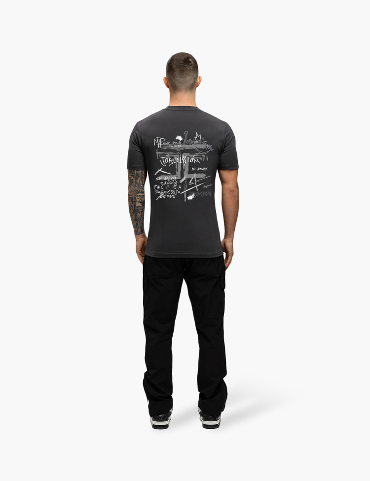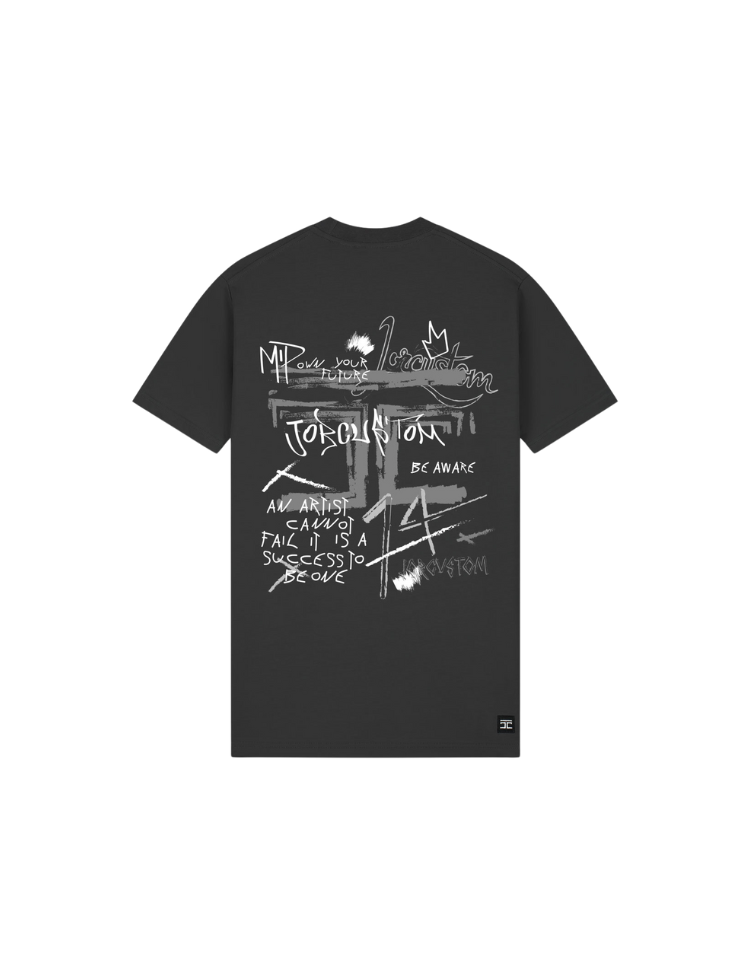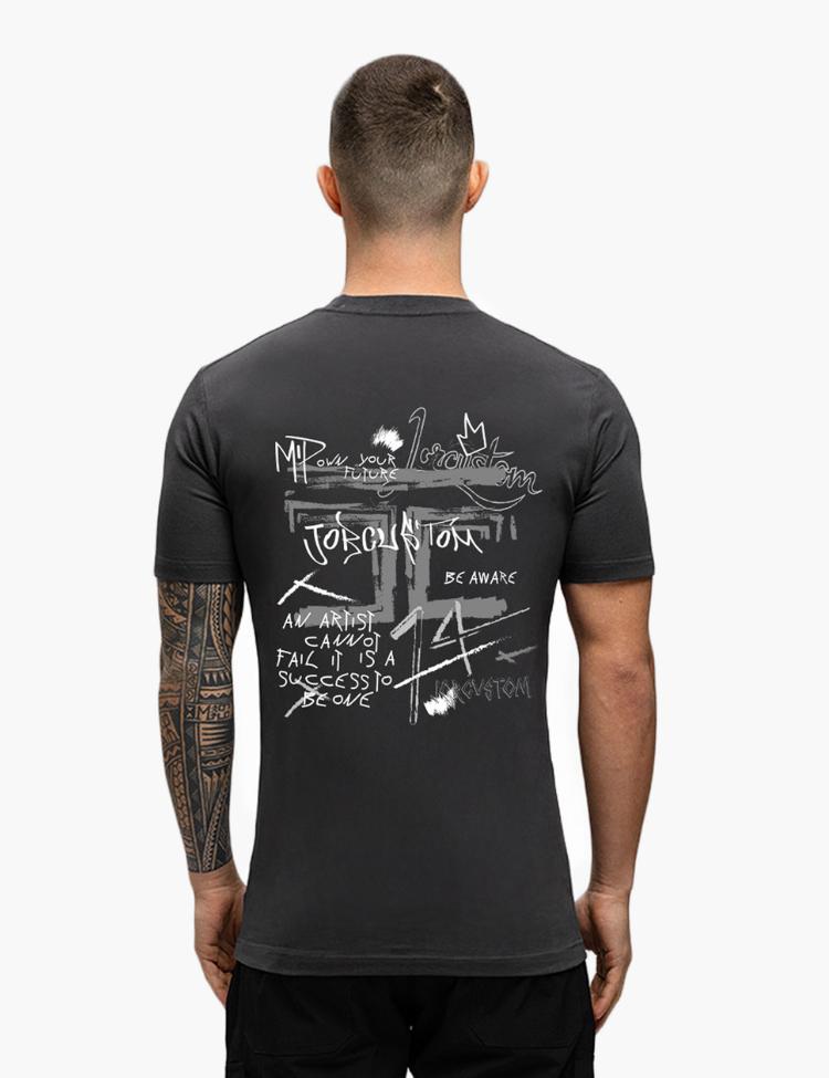 Het JorCustom Artist Slim Fit T-shirt in antraciet is een krachtig kledingstuk met een diepere boodschap. De achterkant van het shirt is voorzien van een opvallende artistieke print met typografie, handgeschreven quotes en grafische elementen. De quote “An artist cannot fail. It is a success to be one.” drukt de creatieve kern van JorCustom perfect uit.