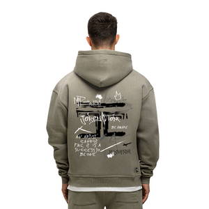 Deze oversized hoodie kenmerkt zich door een opvallende grafische rugprint met tekstuele elementen en artistieke accenten. Het relaxte silhouet wordt versterkt door de kangoeroezak aan de voorzijde en de geribbelde boorden bij de mouwen en zoom. Op de borst zie je subtiele JC-branding, terwijl de achterkant verschillende handgeschreven teksten en zwarte vlakken toont. De zachte capuchon met trekkoorden biedt extra comfort. Deze vintage groene trui combineert streetwear-esthetiek met een eigentijdse twist door de expressieve artwork.