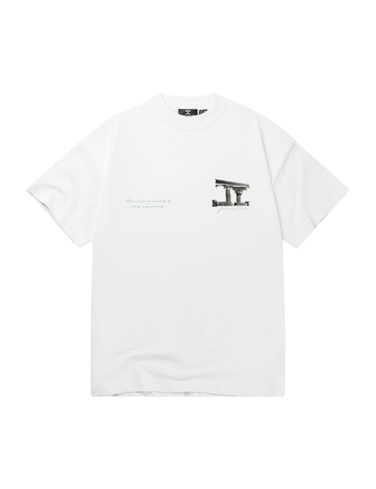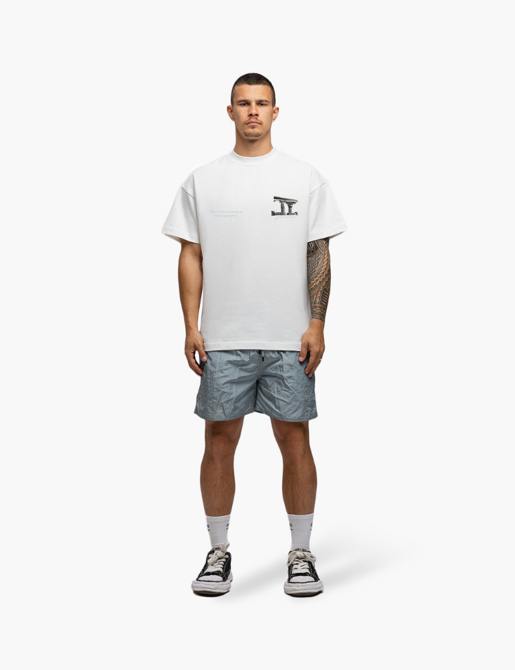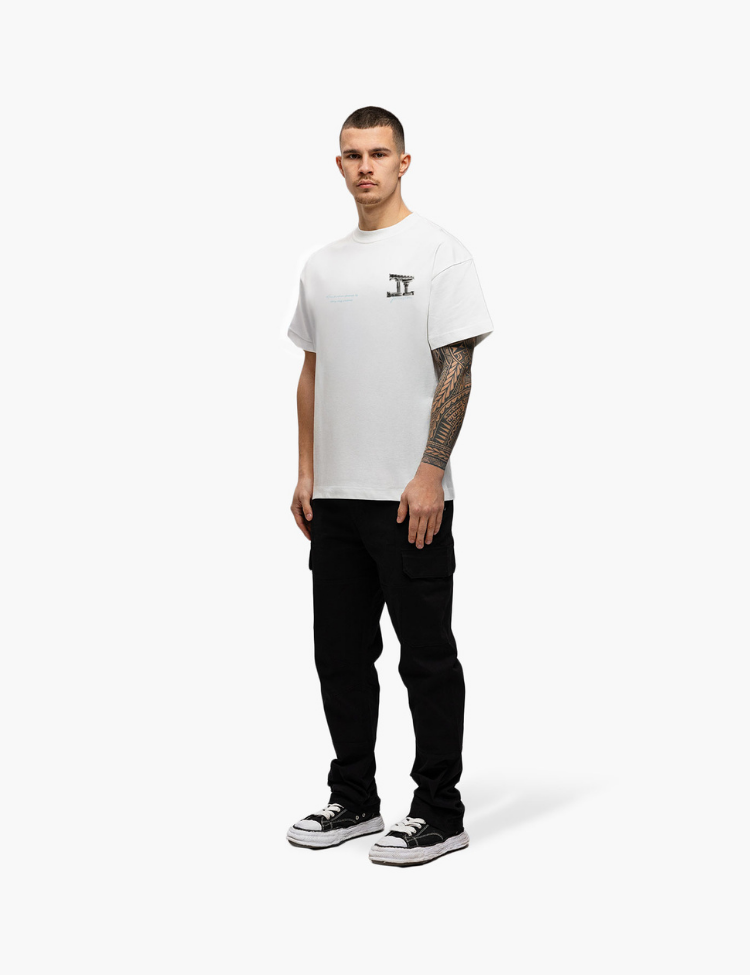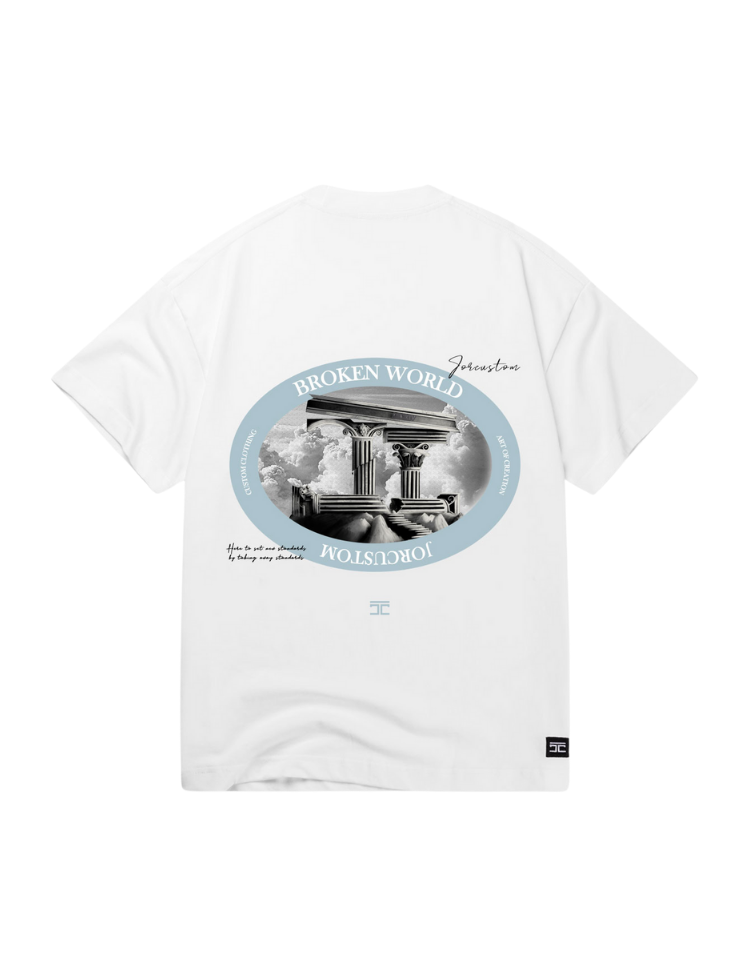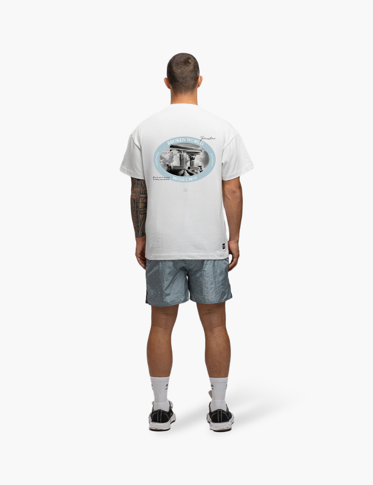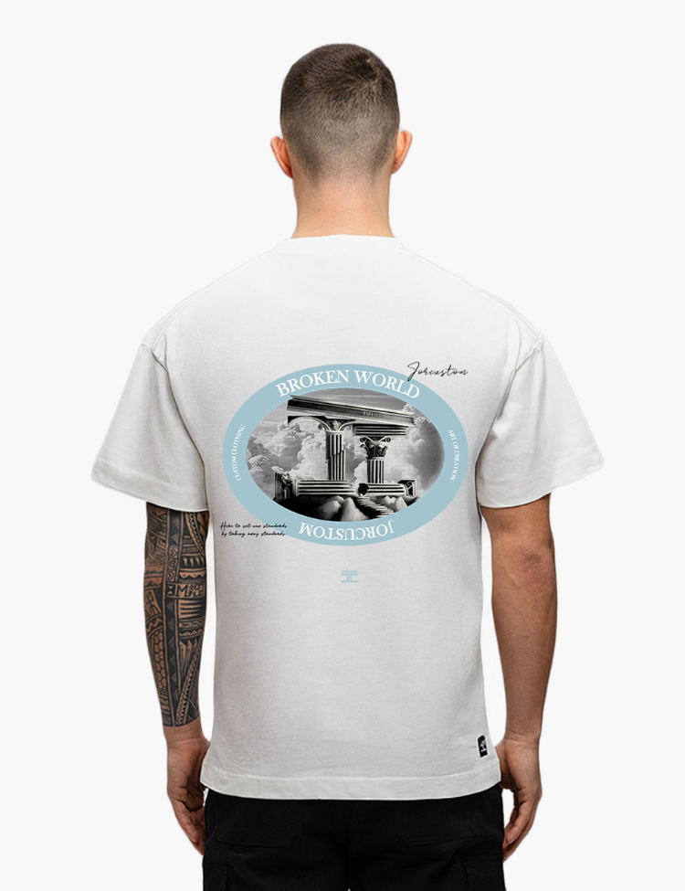 Deze oversized T-shirt is vervaardigd van 100% katoen met een stevige en zachte structuur. De korte mouwen vallen ruim over de bovenarmen en de loose fit pasvorm biedt veel bewegingsvrijheid. Het shirt is uitgevoerd in een effen witte kleur. Op de rug bevindt zich een grote print met zuilen en de tekst ‘Broken World’. De borst is voorzien van een kleinere print in dezelfde stijl. Geschikt om te dragen met cargopants, jeans of shorts.