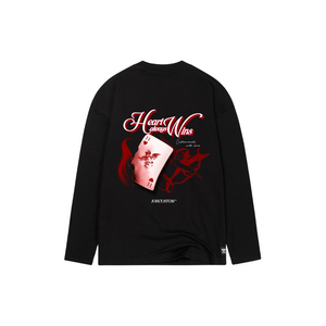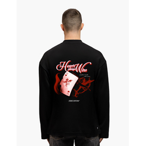 Dit zwarte longsleeve shirt heeft een opvallende grafische print op de achterzijde. De print toont een speelkaart met de tekst "Heart Always Wins" in rode letters, vergezeld van vlammen en het JorCustom logo. Op de voorzijde zie je subtiele rode tekstdetails op de borst. Het shirt heeft een ronde hals en lange mouwen met een relaxte pasvorm. De zwarte kleur vormt een sterk contrast met de rode accenten in het design.