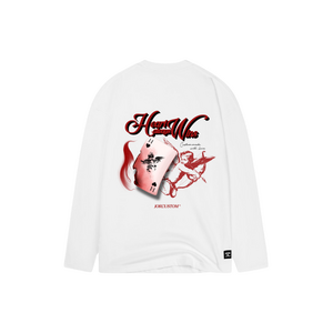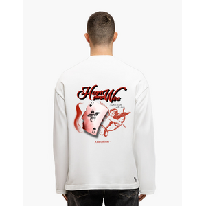 Dit witte longsleeve shirt kenmerkt zich door een opvallende grafische print op de rugzijde. De print toont "Heart Always Wins" tekst met een speelkaart illustratie van een hartenaas en cupido figuur in rode tinten. Op de voorzijde bevinden zich kleinere prints op borsthoogte met dezelfde cupido illustratie en JorCustom branding. Het shirt heeft een ronde hals en lange mouwen met een relaxed silhouet dat comfortabel draagt.