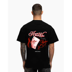 Dit zwarte loose fit t-shirt van JorCustom heeft een ronde hals en korte mouwen. Op de achterkant staat een opvallende grafische print met de tekst "Heart Always Wins", een speelkaart en rode accenten. De voorkant toont subtiele rode tekstdetails op borsthoogte. Het shirt heeft een ruime, comfortabele pasvorm die je veel bewegingsvrijheid geeft. De zachte katoenmix voelt aangenaam aan op je huid.