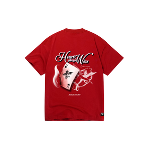 Dit rode t-shirt met loose fit pasvorm heeft een opvallende grafische print op de achterzijde. De print toont een speelkaart met cupido-illustratie en de tekst "Heart Always Wins". Op de voorkant staat subtiele tekst met een klein cupido-motief. Het shirt heeft een ronde hals, korte mouwen en een relaxed silhouet dat ruim valt rond het lichaam. De rode kleur geeft dit streetwear item direct karakter.