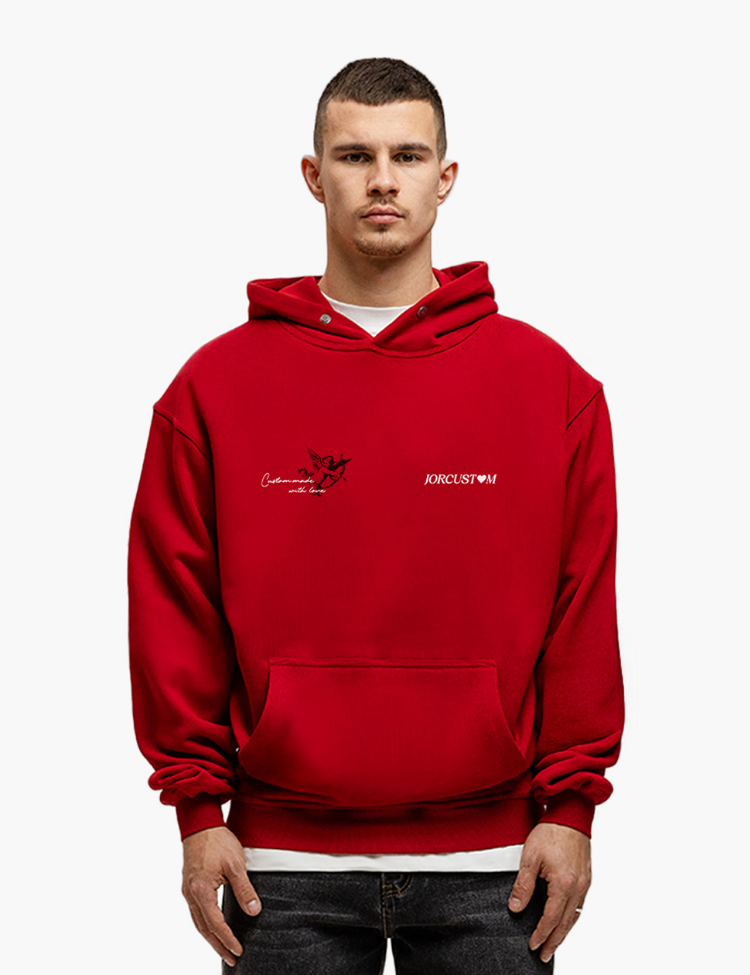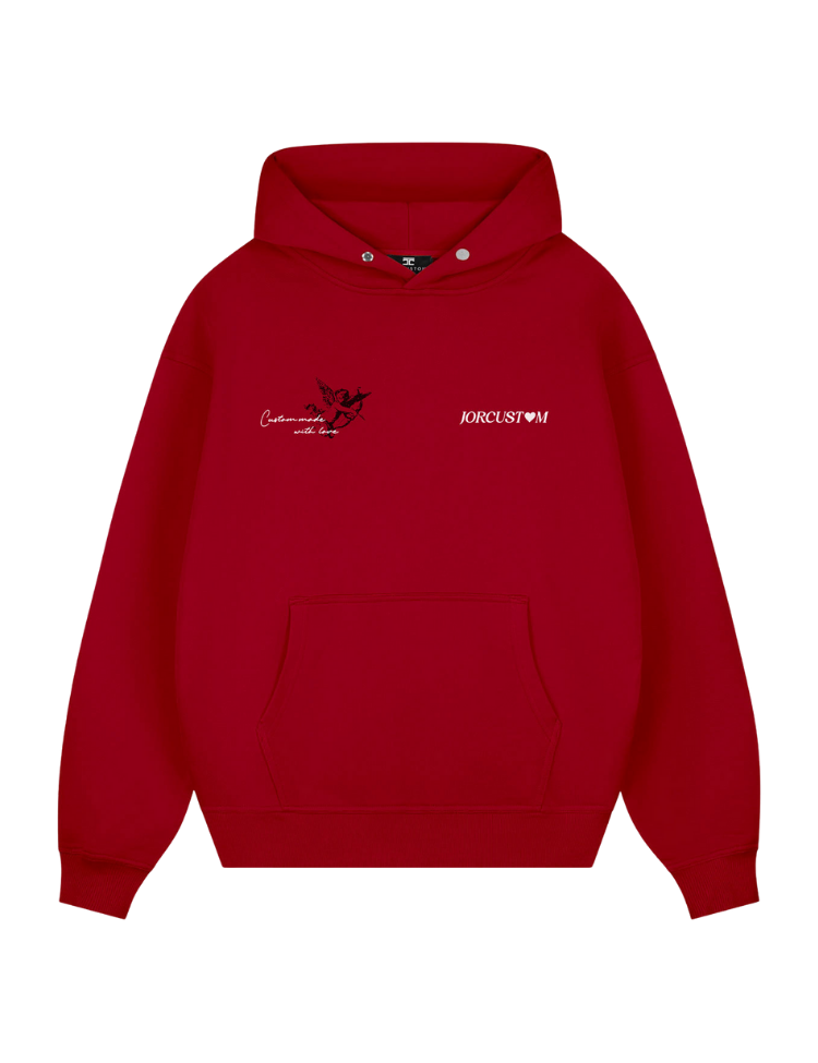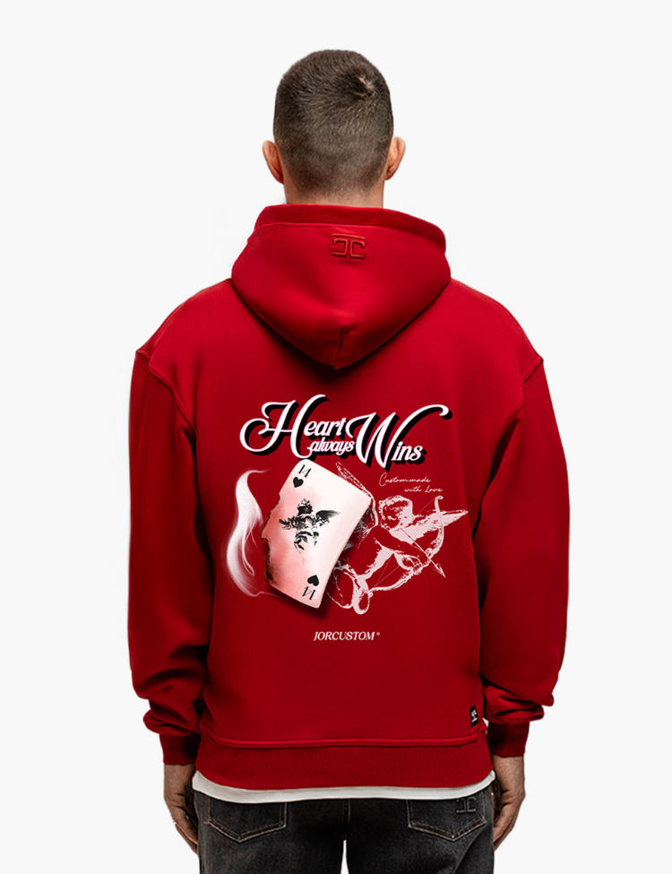 Deze rode oversized hoodie van JorCustom heeft een ruime pasvorm met capuchon en kangoozak aan de voorzijde. Op de rug staat een opvallende grafische print met de tekst "Heart Always Wins", een speelkaart met hartenaas en een cupido-illustratie. De voorkant toont subtiele tekstdetails met "Custom made with love" en het JorCustom logo. De sweatstof voelt comfortabel aan en de ribboorden bij de mouwen en zoom zorgen voor een goede afwerking. Het oversized silhouet geeft je outfit direct een relaxte streetwear uitstraling.