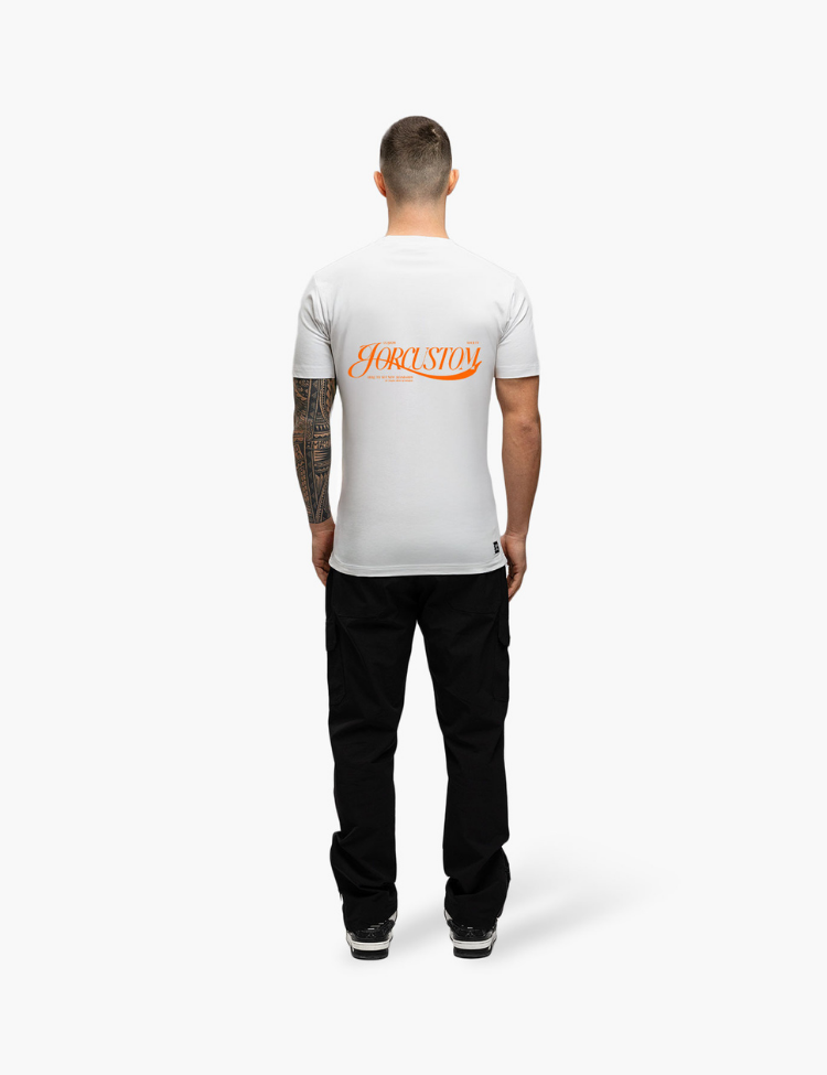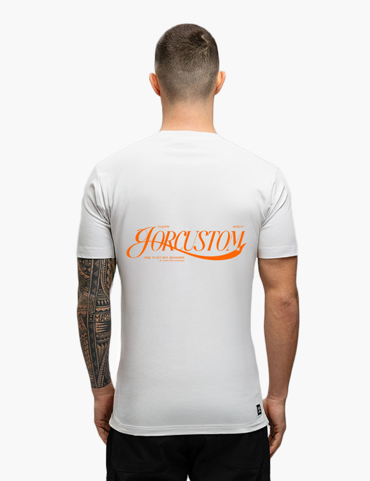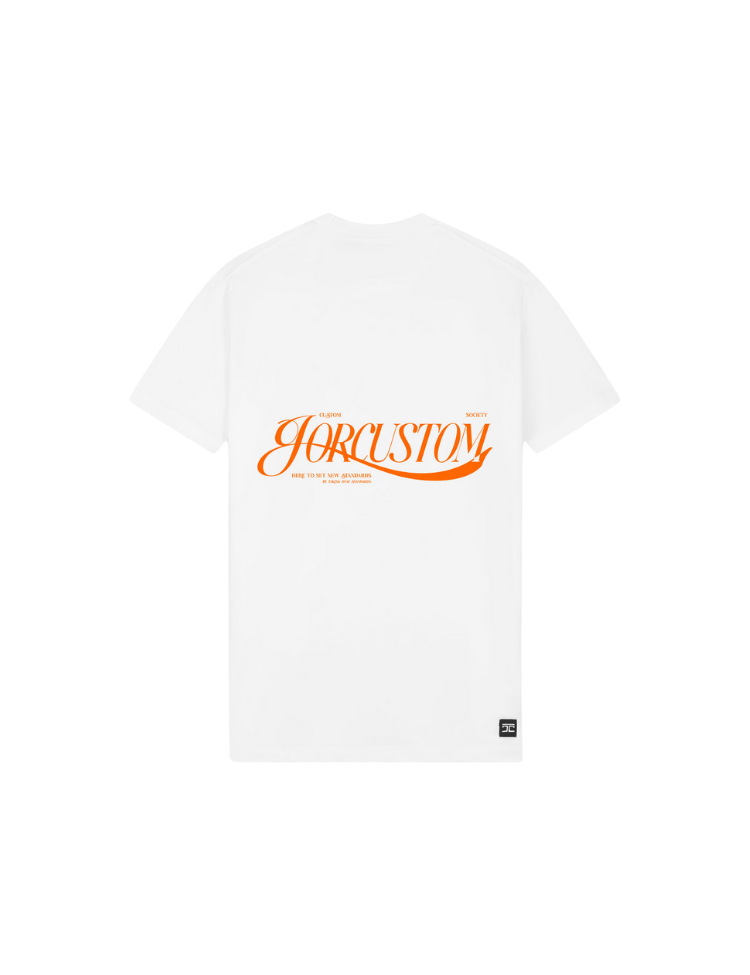 De slim fit pasvorm zorgt voor een moderne, aansluitende look zonder in te leveren op comfort. De hoogwaardige katoenen stof voelt zacht aan en is ademend, waardoor je zelfs op drukke, zonnige dagen koel blijft. Op de rug pronkt het kenmerkende JorCustom-script in een krachtige, oranje typografie – een subtiel maar uitgesproken statement dat je look net dat beetje extra geeft.