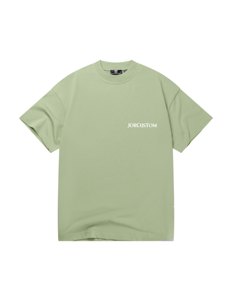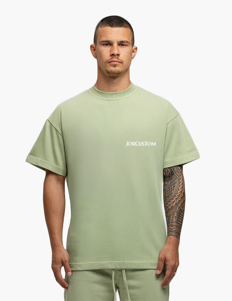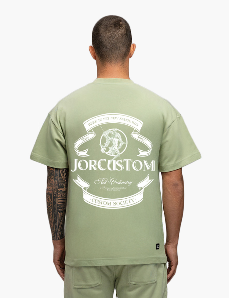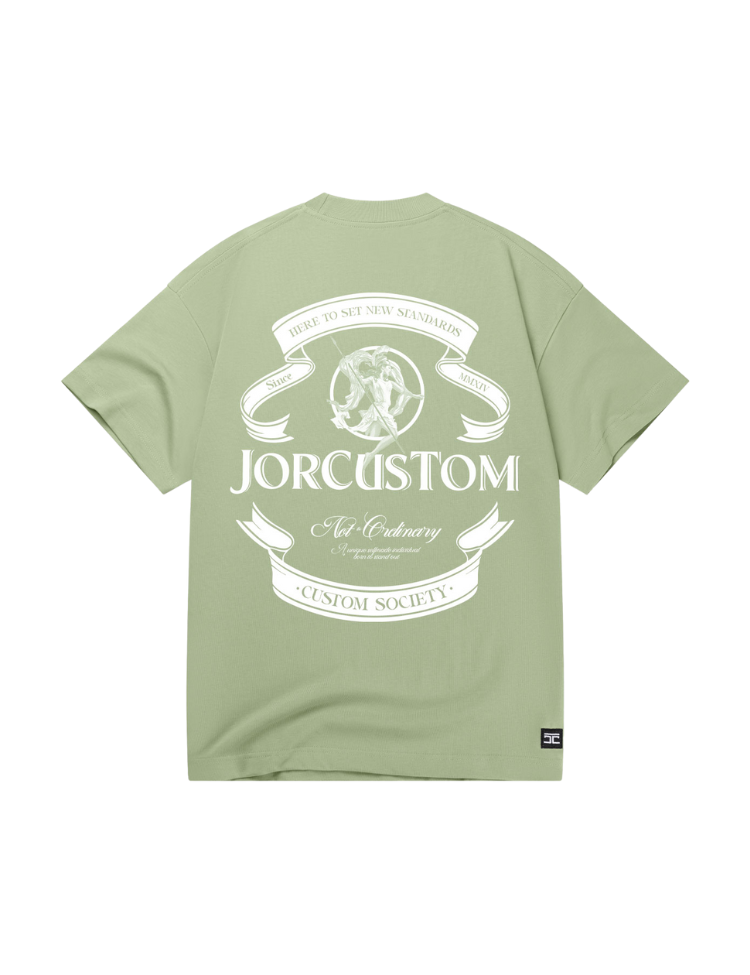 Upgrade je streetwear met de Ribbon Loose Fit T-Shirt van JorCustom in de frisse kleur Sage Green. Deze oversized tee ademt karakter en luxe dankzij de opvallende backprint met barokke typografie, klassieke banners en het unieke “Custom Society” artwork.