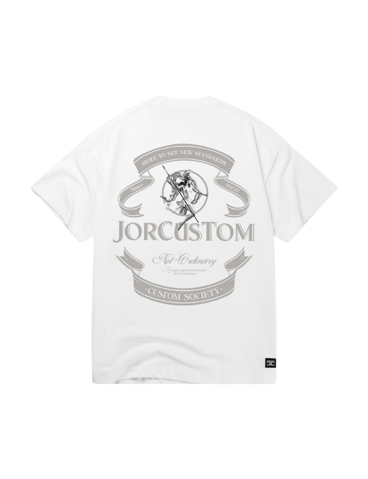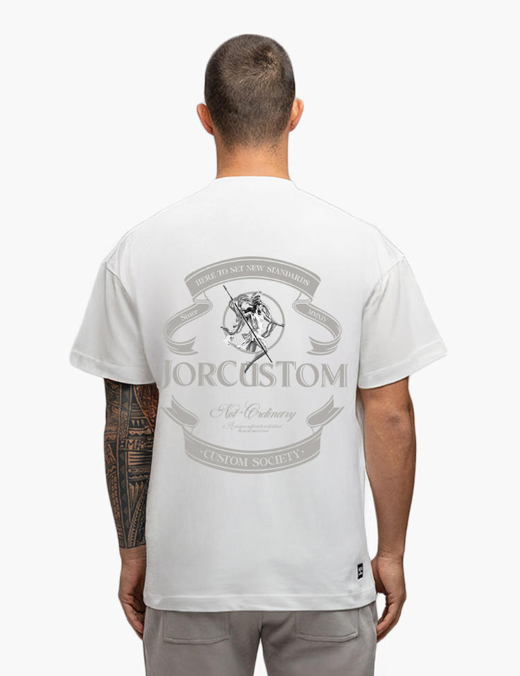 Op de rug vind je een opvallende grafische print met sierlinten, tekst en illustratie in contrasterend grijs – een ode aan de custom society mentaliteit van nu. Het subtiele zwarte logolabel rechtsonder maakt dit shirt helemaal af.