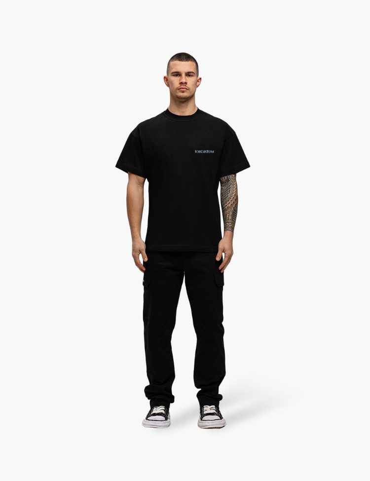 De JorCustom Ribbon Loose Fit Tee in het zwart is een casual T-shirt met korte mouwen en een losse pasvorm. Gemaakt van hoogwaardig katoen voor optimaal draagcomfort en ademend vermogen. De ronde hals en ruime fit zorgen voor een relaxte uitstraling. Op de achterkant vind je een opvallende grafische ribbon-print in lichtblauw, terwijl de voorkant subtiel is afgewerkt met het JorCustom-logo. Perfect te combineren met een zwarte cargo of denim.