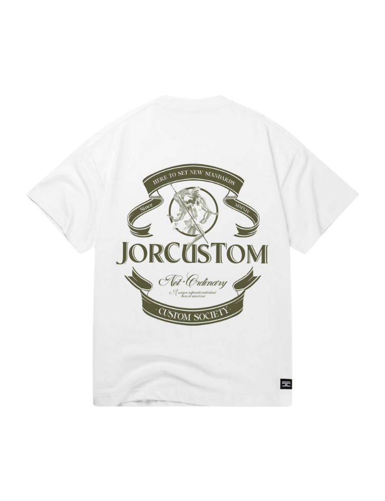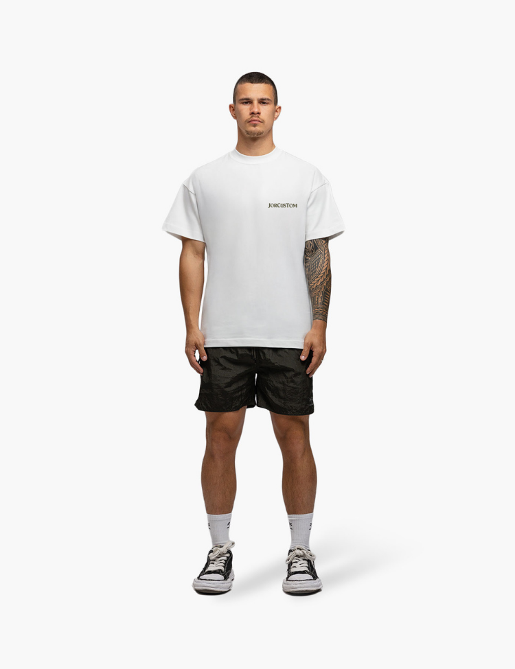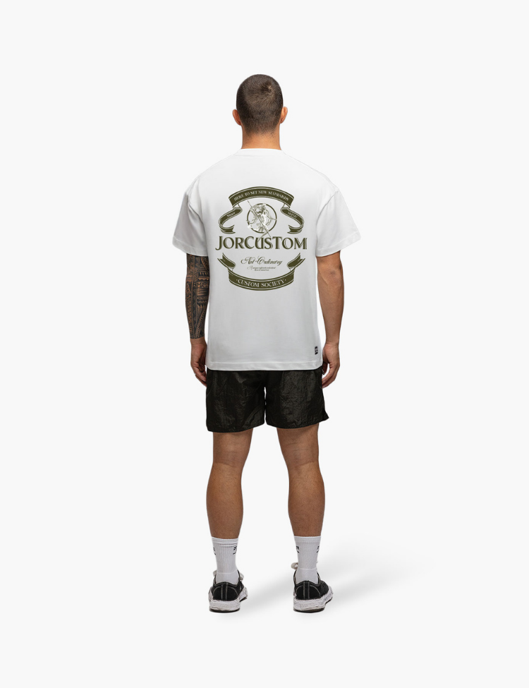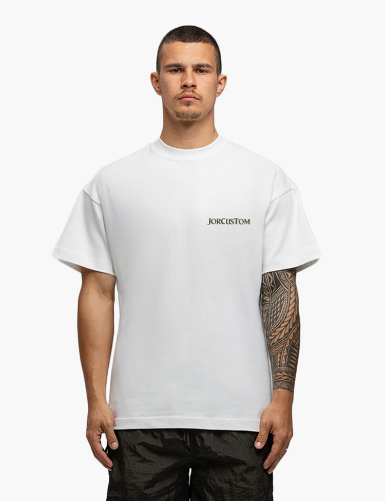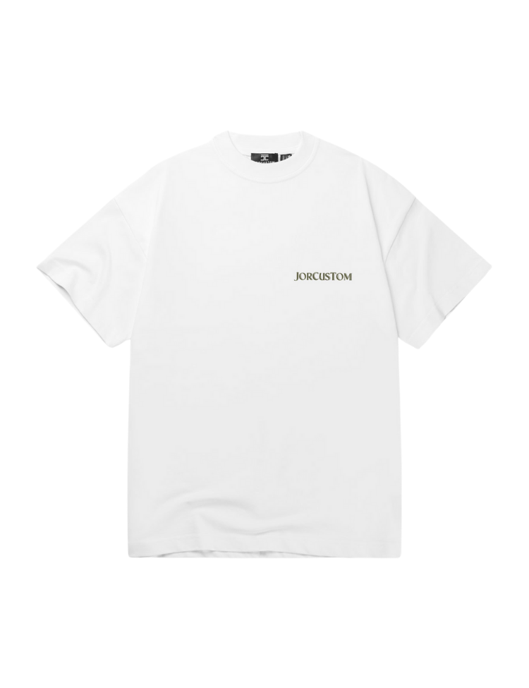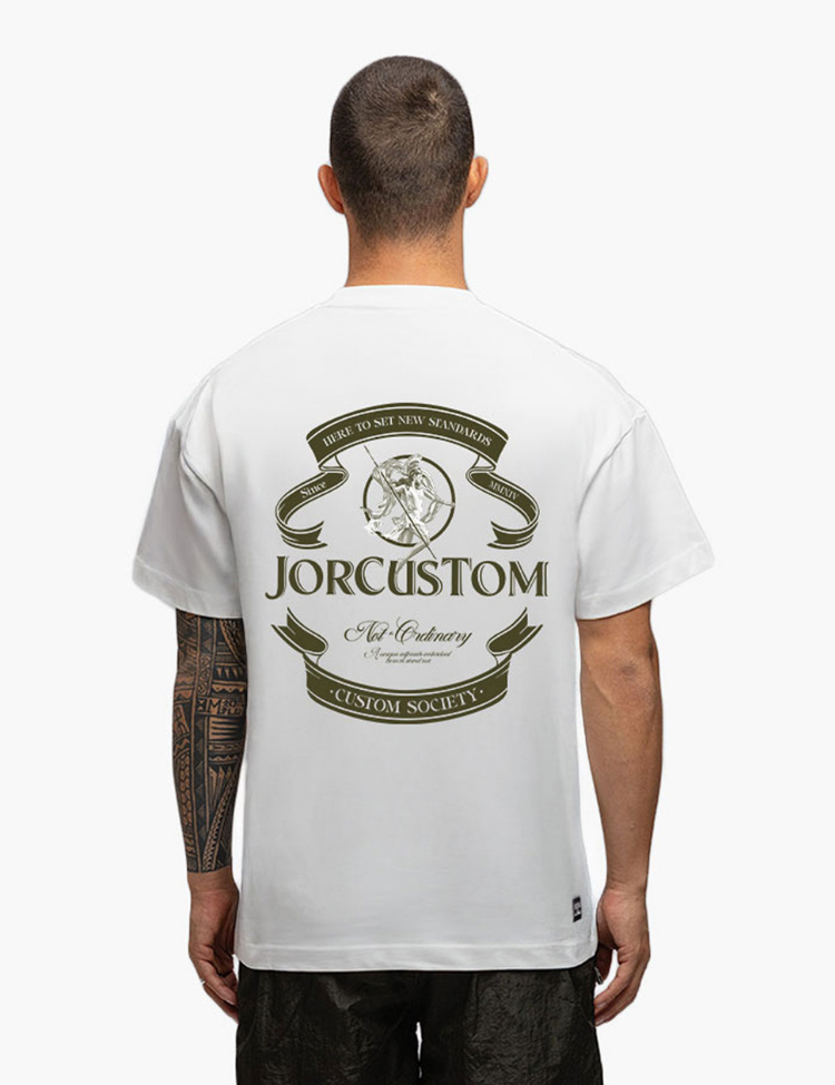 De JorCustom Not Ordinary Tee in wit is een losvallend T-shirt met korte mouwen en een rechte pasvorm. Het shirt is vervaardigd van 100% katoen en voelt comfortabel en licht aan op de huid. De ronde halslijn is afgewerkt met een ribboord voor een klassieke look. Op de borst staat een klein logo, terwijl de rug wordt gesierd door een grote grafische print met vintage invloeden. Dit T-shirt laat zich moeiteloos combineren met een zwarte short of jeans en maakt iedere casual outfit krachtig.