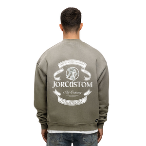 Deze crewneck sweater van JorCustom heeft een relaxte oversized fit met dropped shoulders voor een comfortabele pasvorm. Op de achterzijde staat een grote grafische print met linten, een cirkel met figuur en de tekst "JORCUSTOM", "Art Ordinary" en "Custom Society". De voorkant toont subtiel het JorCustom logo op borsthoogte. Gemaakt met een sunfade effect dat de vintage green kleur extra karakter geeft. De ribgebreide boorden bij de hals, mouwen en zoom zorgen voor een nette afwerking.