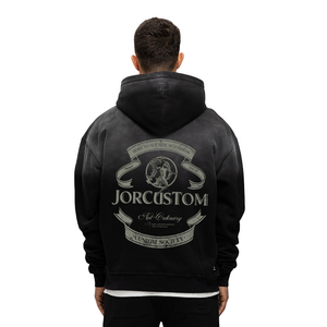 Deze oversized hoodie van JorCustom heeft een opvallend sunfade effect dat van grijs naar zwart verloopt. De capuchon met trekkoord geeft extra comfort. Op de voorzijde staat subtiele JorCustom branding, terwijl de achterkant een groot grafisch ontwerp toont met linten en tekst in cirkelvorm. De kangoozak biedt praktische opbergruimte. Ribboorden bij de mouwen en zoom zorgen voor een goede pasvorm bij deze relaxte trui.