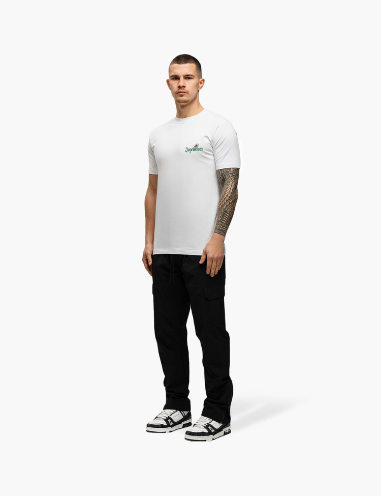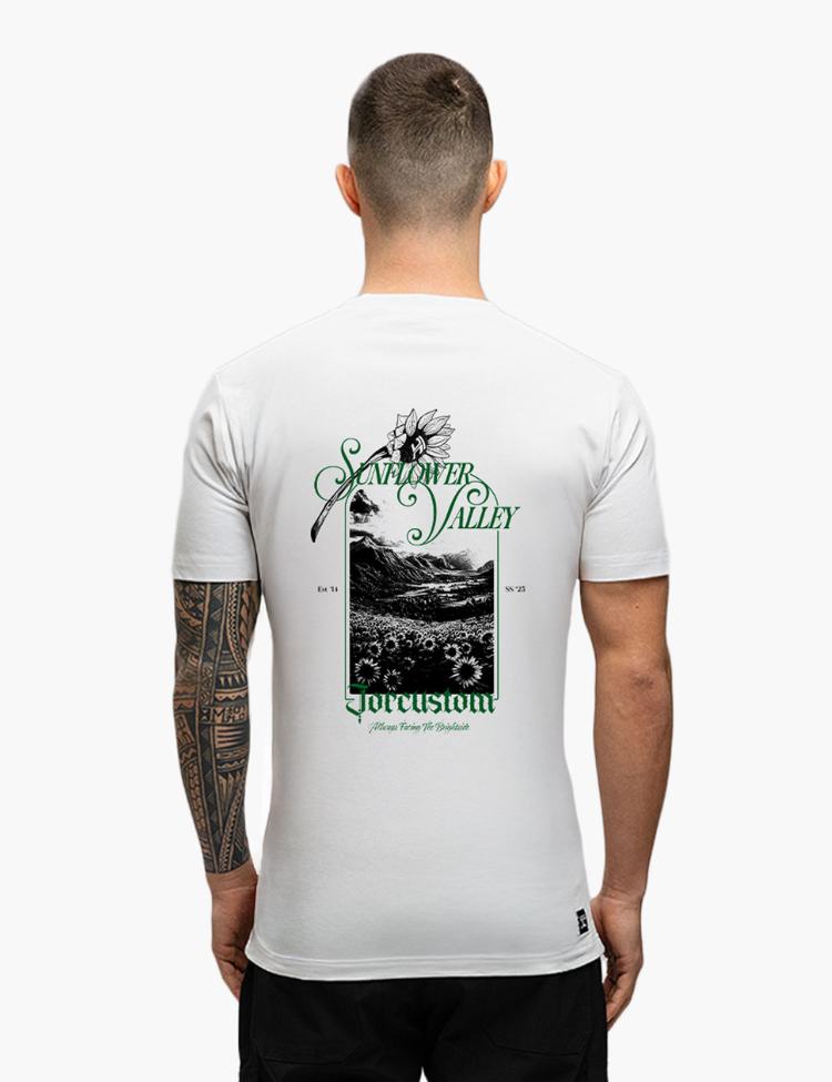 Het JorCustom Sunflower Slim Fit T-Shirt in wit combineert een moderne pasvorm met artistieke details. Dit premium Slim Fit T-shirt is gemaakt van 93% hoogwaardig katoen en 7% spandex, waardoor het comfortabel zit en zich mooi naar het lichaam vormt. De Sunflower Valley print op de achterkant geeft het shirt een unieke en stijlvolle uitstraling, perfect voor casual en trendy outfits.