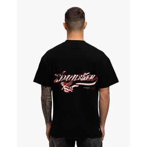Dit zwarte t-shirt van JorCustom heeft een relaxte loose fit pasvorm met korte mouwen en ronde hals. Op de rug staat een opvallende graphic print met rode en witte accenten, waarbij een engelenfiguur centraal staat. De voorkant toont een compacte versie van dezelfde print op borsthoogte. Het shirt heeft een rechte zoom en de kenmerkende JorCustom branding is zichtbaar verwerkt in het design.