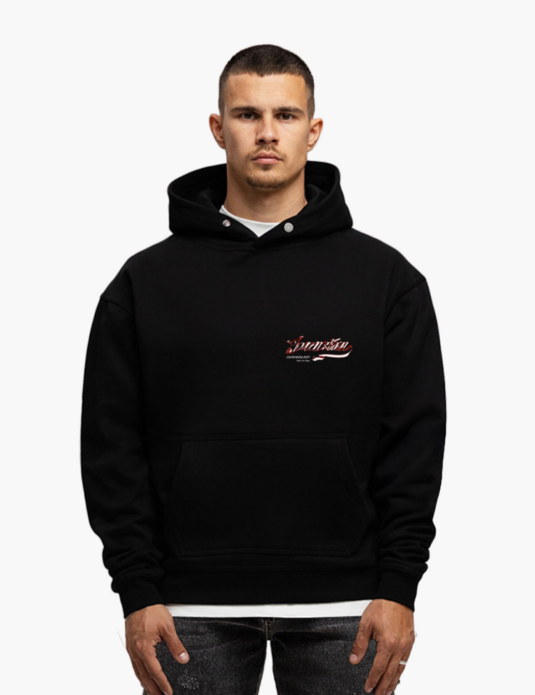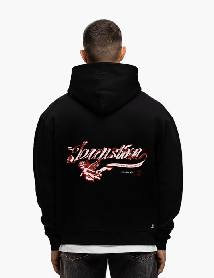 Deze oversized hoodie van JorCustom komt met een opvallende grafische print op de achterkant. Het design toont een engelachtige figuur met uitgestrekte vleugels en het woord "JorCustom" in rode en witte tinten. Op de voorzijde zie je een kleinere versie van dezelfde tekst op borsthoogte. De hoodie heeft een ruime capuchon met trekkoorden, een kangoozak aan de voorkant en ribboorden bij de mouwen en zoom. De zwarte kleur zorgt voor een sterke basis die je makkelijk combineert met verschillende stijlen.