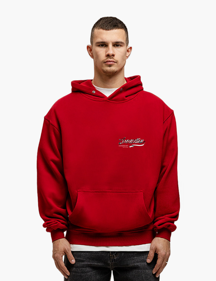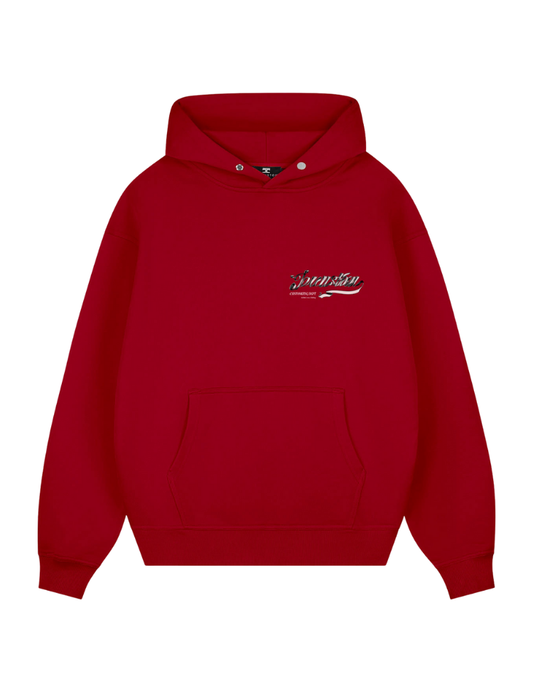 De rode hoodie van JorCustom combineert perfect met de donkere jeans zoals gedragen op de foto. Het witte shirt dat eronder gedragen wordt creëert een gelaagde look die diepte geeft aan je outfit.