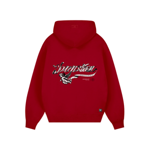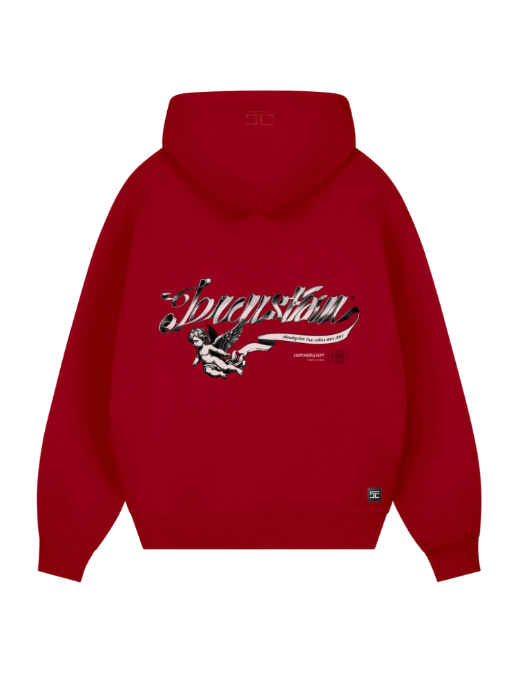 Deze oversized hoodie kenmerkt zich door de opvallende grafische print met engelenfiguur op de achterzijde. Het rode sweatshirt heeft een ruime kangoeroezak op de voorkant en een capuchon met trekkoord. De ribboorden bij de mouwen en zoom zorgen voor een goede pasvorm. Op de borst staat een kleinere versie van de JorCustom print. De relaxte oversized fit geeft je bewegingsvrijheid en draagcomfort voor dagelijks gebruik.