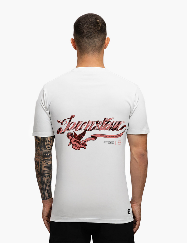 Dit witte t-shirt van JorCustom heeft een slim fit pasvorm die mooi aansluit. Op de rug zie je een opvallende print met de tekst "Jorcustom" in rode letters, vergezeld van een engelenfiguur. De voorkant toont een kleinere versie van dezelfde branding op borsthoogte. Het shirt heeft korte mouwen en een ronde hals. De strakke pasvorm geeft je outfit een moderne uitstraling. Het zwarte label onderaan voegt een subtiel detail toe aan het design.