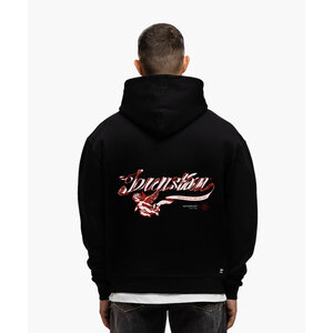 Deze zwarte hoodie van JorCustom heeft een doorlopende ritssluiting en capuchon. Op de borst en rug zie je een opvallende grafische print met rode accenten en vloeiende lijnen. Het sweatshirt heeft een regular fit met elastische boorden bij de mouwen en zoom. De kangoeroezakken aan de voorzijde maken het design compleet. Deze zip-up hoodie combineert sportieve elementen met streetwear details voor een eigentijdse look.
