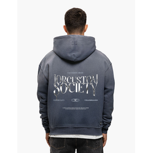 Deze oversized hoodie heeft een opvallende sunfade print met de tekst "JorCustom Society" op de achterzijde. De capuchon is ruim gesneden en het sweatshirt heeft een kangoeruzak op de voorkant. Subtiele tekstdetails zoals "Uncommon Minds", "Individuality" en "Trademark" zijn zichtbaar op zowel voor- als achterzijde. De ribboorden bij de mouwen en zoom zorgen voor een goede pasvorm. Het JorCustom logo is geplaatst op de capuchon en onderaan het design.