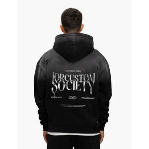 Deze zwarte hoodie van JorCustom heeft een opvallend sunfade effect dat van grijs naar diepzwart verloopt. De vest is voorzien van een doorlopende ritssluiting en capuchon. Op de rug staat groot "JorCustom Society" met kleinere teksten zoals "Uncommon Minds", "Individuality" en "Trademark". Het JorCustom logo is subtiel geborduurd op de borst. De ribboorden bij de mouwen en zoom zorgen voor een goede pasvorm. Deze streetwear hoodie combineert comfort met een sterke grafische uitstraling.