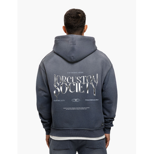 Deze hoodie van JorCustom heeft een opvallend ombré blauw kleurverloop dat van licht naar donker loopt. Het sweatvest is voorzien van een doorlopende ritssluiting aan de voorkant en een ruime capuchon. Op de achterzijde staat een grote metallic print met de tekst "JORCUSTOM SOCIETY" in spiegelende letters. De oversized pasvorm zorgt voor een relaxte fit, terwijl de geribde boorden bij de mouwen en zoom het geheel netjes afwerken. Het kleine logo op de borst maakt het design compleet.
