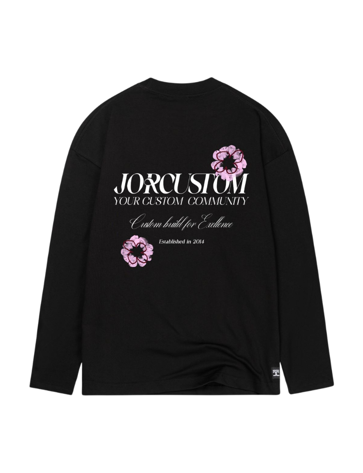 De JorCustom Women Flowers longsleeve T-shirt in zwart heeft lange mouwen en een ronde hals. Op de achterkant staat een grote print met de tekst JORCUSTOM, YOUR CUSTOM COMMUNITY, Custom built for Excellence en Established in 2014, aangevuld met twee bloemdetails in blauw en geel. Onderaan zit een klein merklabel. Dit zwarte longsleeve shirt werkt sterk als statement binnen je outfit.