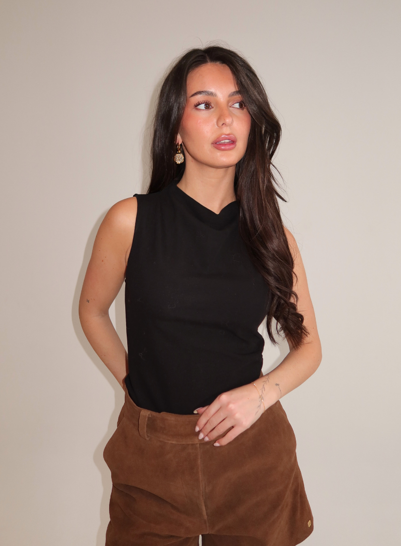 Deze zwarte top van Josh V heeft een strakke mouwloze pasvorm met een licht verhoogde ronde halslijn. Het shirt is uitgevoerd in een geribde kwaliteit die structuur toevoegt. Aan de onderzijde is een goudkleurig merk embleem verwerkt. Het bovenstuk heeft een aangesloten silhouet dat mooi afkleedt.