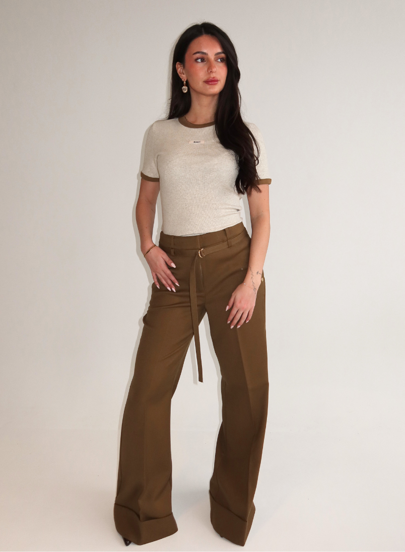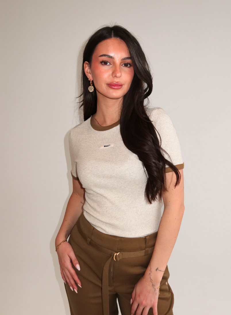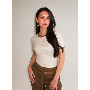 Een verfijnd shirt in ecru melange met contrasterende okerkleurige boordjes langs de ronde hals en korte mouwen. De ribbel structuur in de stof geeft textuur en karakter. Op de borst zit een klein label met JOSH V in zwarte letters. De afgeronde zoom en aangesloten pasvorm zorgen voor een verzorgde uitstraling. Het shirt is gemaakt van een soepele ribstof die zijn vorm behoudt.