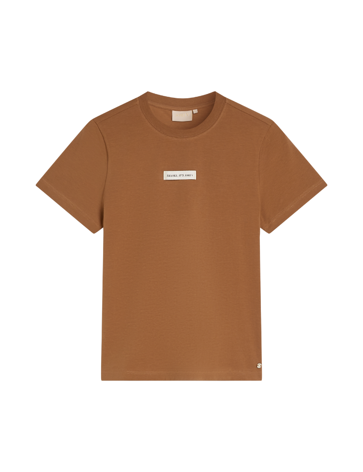 De diepe chocoladebruine kleur geeft dit item een warme, rijke uitstraling die je moeiteloos combineert met neutrale tinten, denim of ton-sur-ton looks. Dankzij de rechte pasvorm, ronde hals en korte mouwen is dit een echte everyday essential die net zo goed solo als onder een blazer gedragen kan worden.