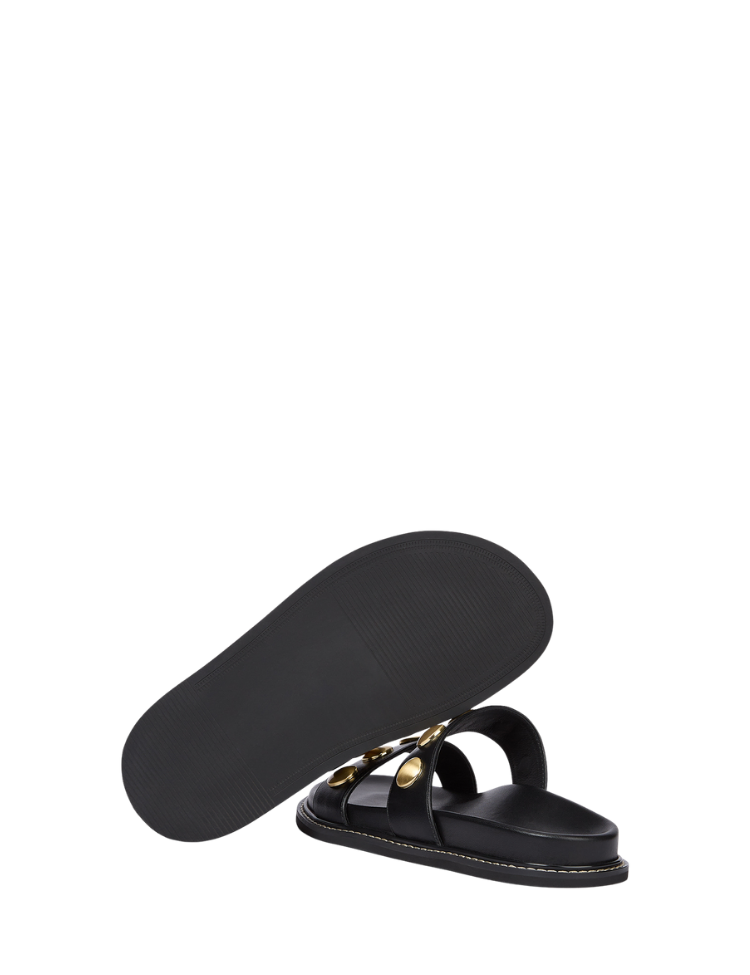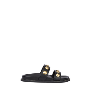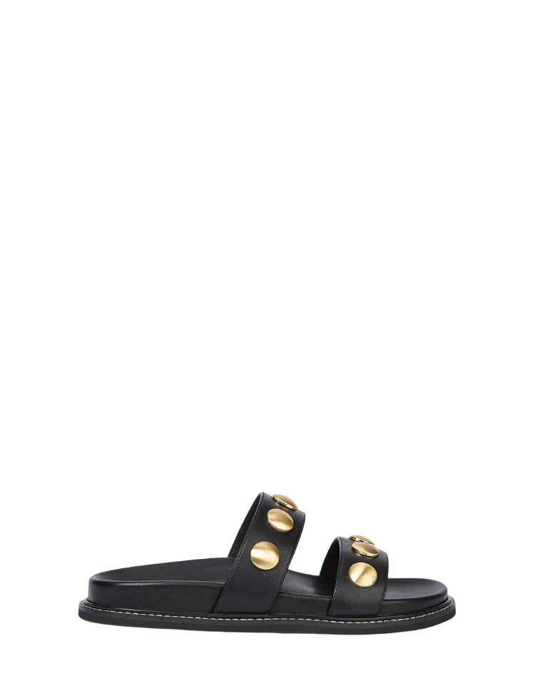 Kleur: Zwart met goudkleurige details Design: Twee brede bandjes met ronde goudkleurige studs Zool: Platte zool met goudkleurig stiksel Artikelnummer: JV-2603-1213