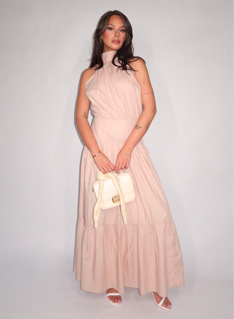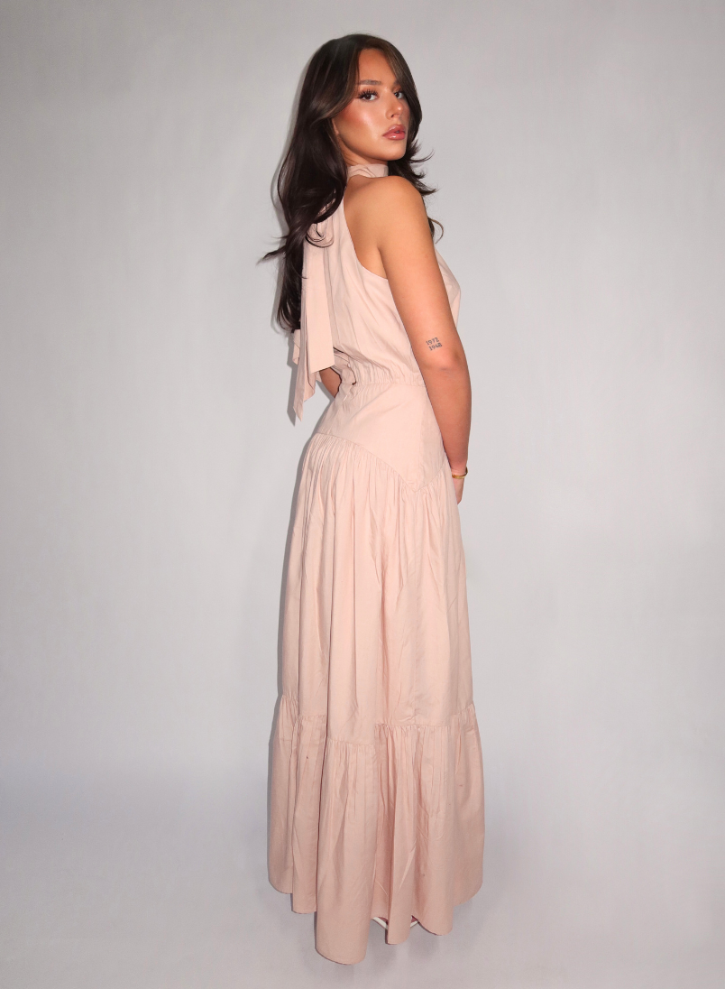 Kleur: Dusty pink Design: Halterneck met strikdetail, gesmookte taille, gelaagde tiered rok Lengte: Maxi Artikelnummer: JV-2603-0407