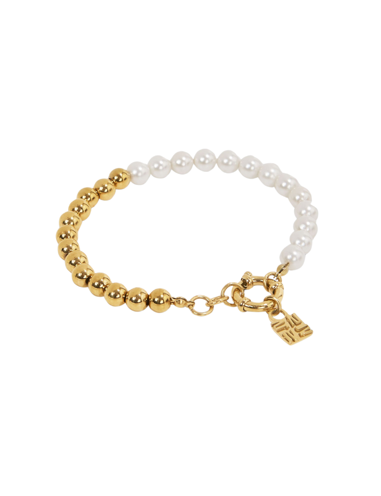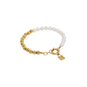 De Josh V Eleia dames armband in de kleur Antique Gold is een aanvulling op iedere sieradencollectie. De armband is gemaakt van roestvrijstaal en fake pearls en verrijkt met een JV-logo bedel. Ga voor de complete sieradenset en combineer de armband met de bijpassende Femm ketting. Of mix & match de parelarmband met de andere armbanden van JOSH V.