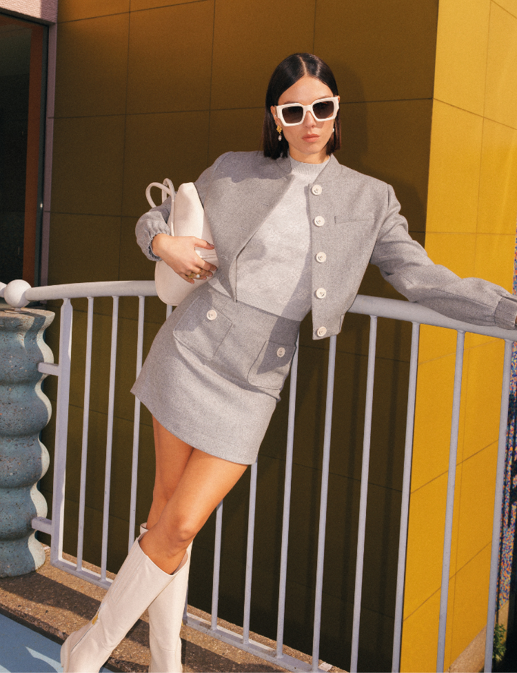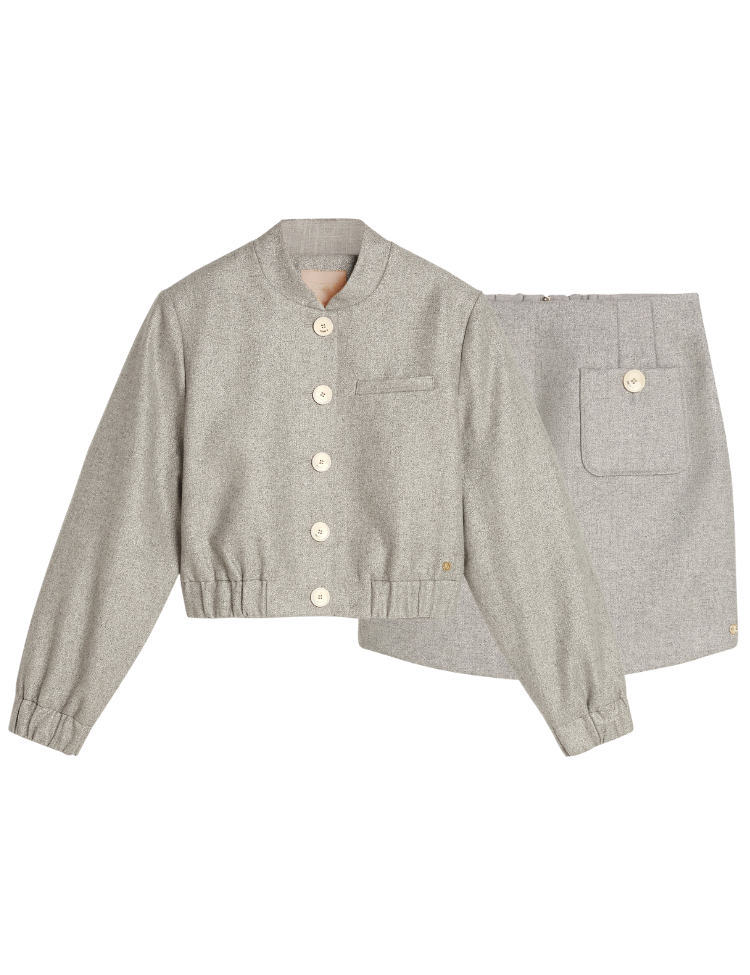 De Josh V Ellen set is de perfecte set voor verschillende gelegenheden! De Fabienne dames bomberjas in de kleur Grey Silver is een mix van wol, gerecycled polyester en lurex. De schoudervullingen en elastische boorden aan de mouwen en onderzijde van het jasje creëren een stoere, edgy look. De Josh V branded knopen maken de grijze bomberjas helemaal af. De Josh V Ellen damesrok in de kleur Grey Silver is gemaakt van een mix met wol, gerecycled polyester en lurex, wat zorgt voor een luxueuze uitstraling. Door middel van een ritssluiting sluit de rok. Daarnaast is het rokje aan de achterzijde voorzien van elastiek voor een comfortabele pasvorm. Stijl de look af met een blouse en laarzen en je bent ready to go.