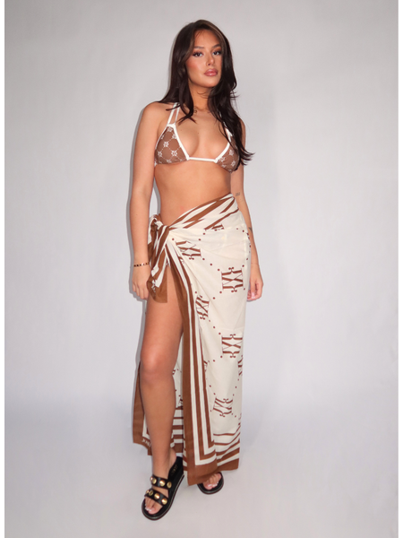 Driehoekige bikini top van Josh V in brown ecru met een allover JV-monogramprint op bruine ondergrond. De ecru bandjes lopen als haltermodel samen aan de nek en sluiten aan de zijkant met verstelbare strikkoordjes. Datzelfde ecru detail keert terug langs de randen van de cups, wat het geheel een verzorgde afwerking geeft. De triangel pasvorm is compact en aansluitend.