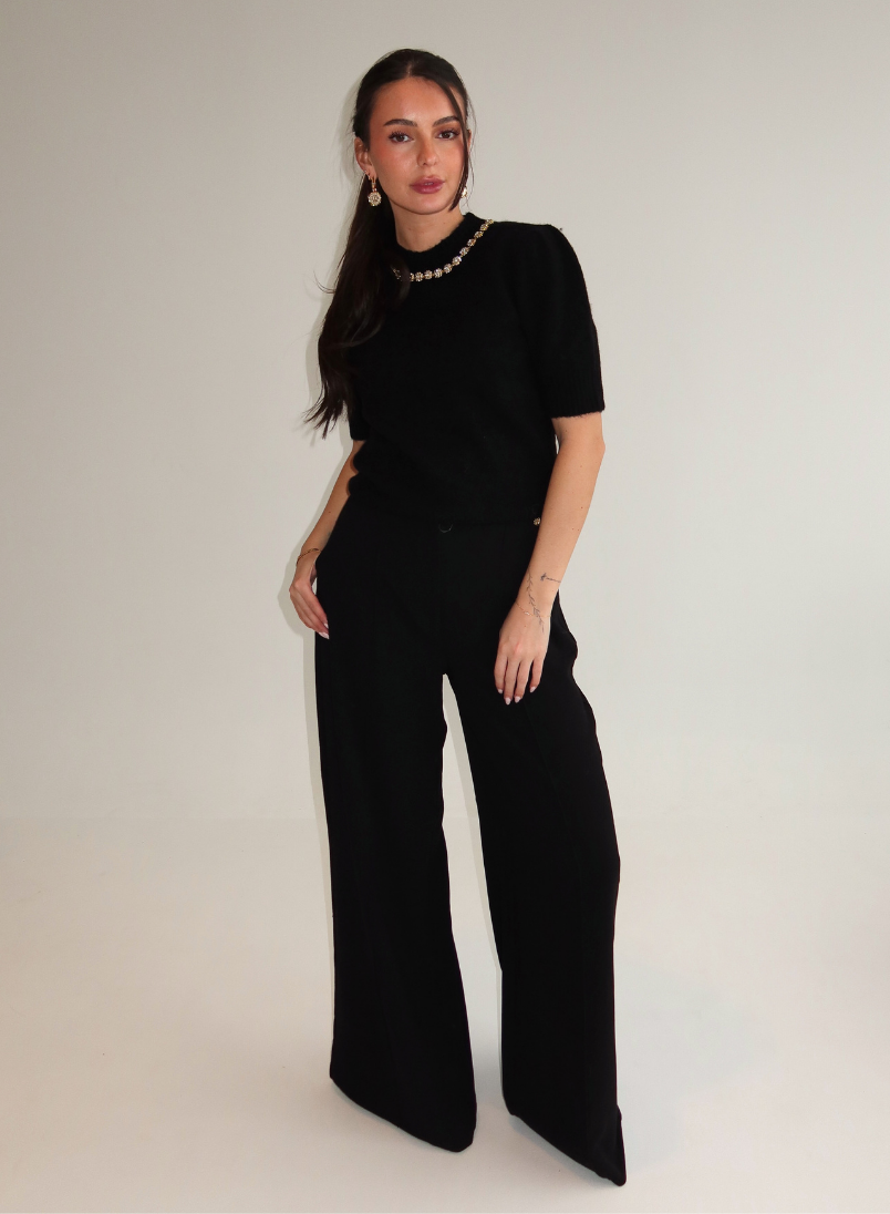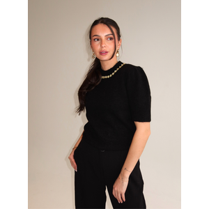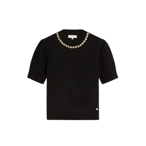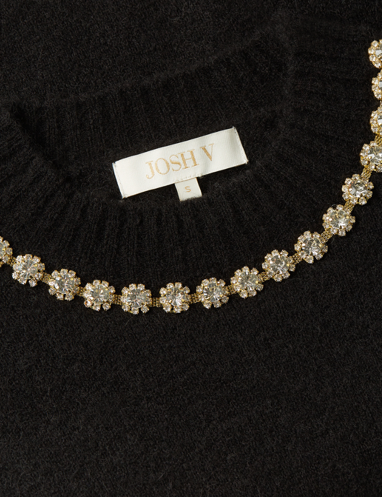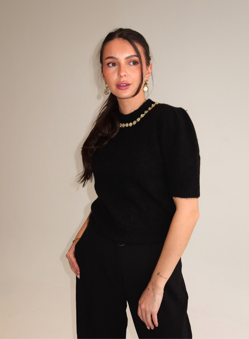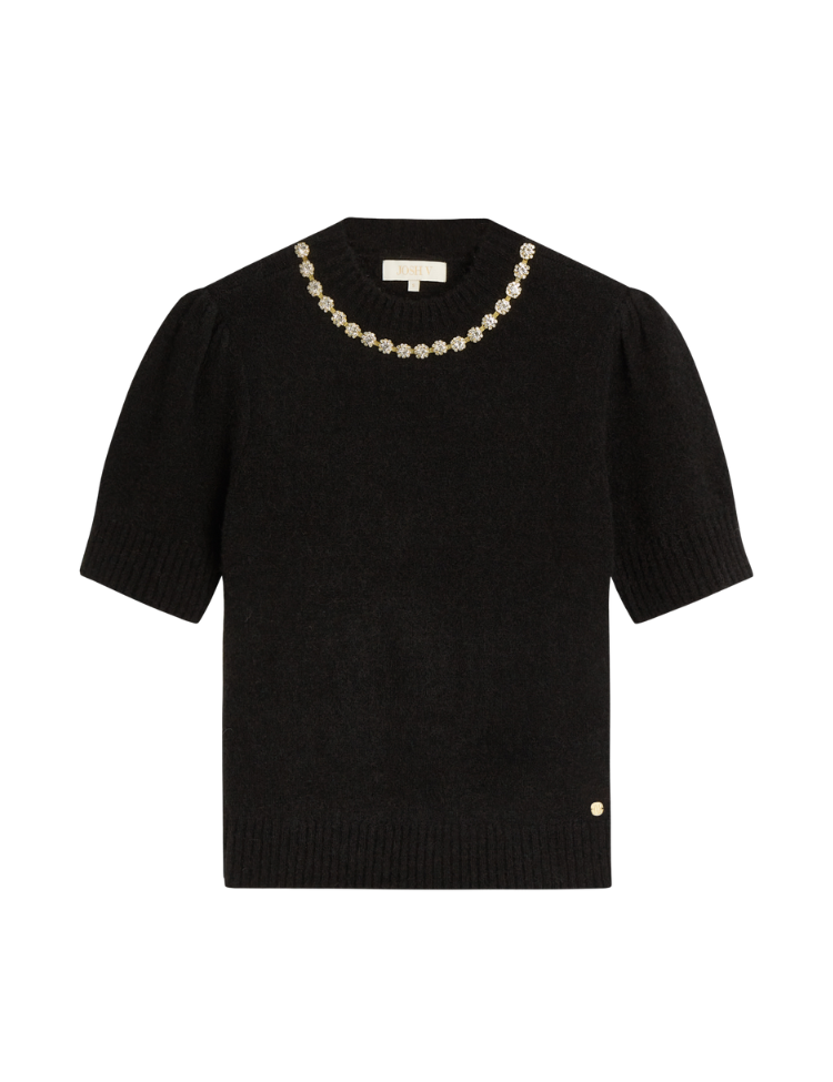 De Josh V Franka Top – Black is een elegante, fijngebreide top met korte mouwen uitgevoerd in een diepe zwarte tint. De top heeft een subtiele pofmouw en ribgebreide boorden voor een vrouwelijke en comfortabele pasvorm. De glinsterende halslijn, rijk gedecoreerd met strass-steentjes in bloemvorm, geeft het item een luxe, sierlijke uitstraling. Het kleine goudkleurige JV-logo onderaan maakt de look compleet. Perfect voor feestelijke gelegenheden, zakelijke chic of een stijlvolle everyday outfit.