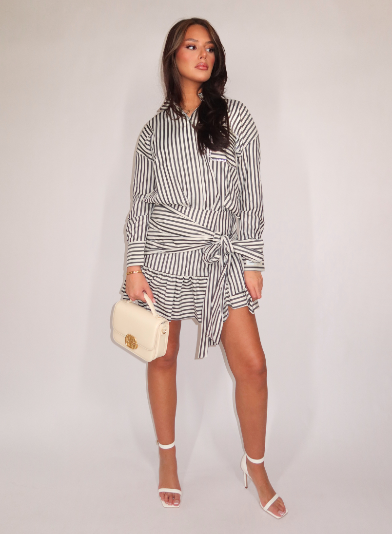 Kleur: Donkerblauw en gebroken wit Design: Streepdessin met oversized strikdetail en ruche zoom Lengte: Mini Artikelnummer: JV-2603-0507