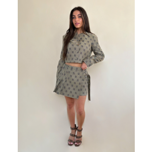 De Josh V Isadee rok is een speelse, geplooide mini skirt met all-over JV-logo jacquardpatroon. De rok heeft een asymmetrisch overslagdetail met een bijpassende ceintuur en goudkleurige gesp. De stevige maar comfortabele stof zorgt voor een mooie pasvorm en luxe uitstraling.