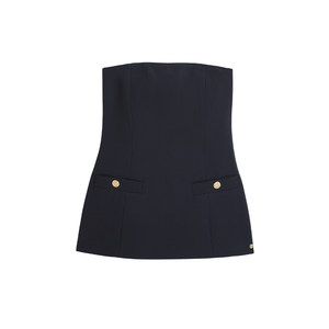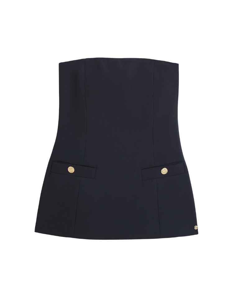 De Josh V Ivy Top - Dark Blue is een elegante strapless top met een luxe uitstraling. De aangesloten pasvorm benadrukt je silhouet en de donkerblauwe kleur geeft de top een stijlvolle, tijdloze look. De gouden knoopdetails aan de voorzijde zorgen voor een chique en vrouwelijke finishing touch. Perfect om te combineren met een pantalon of rok voor een sophisticated avondlook, maar ook stijlvol onder een blazer voor een zakelijke outfit met klasse.