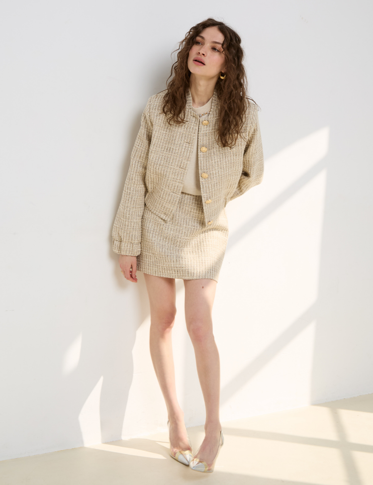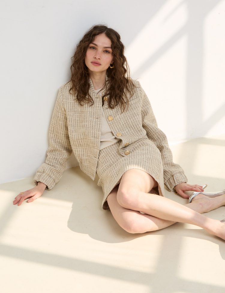Deze tweedelige set bestaat uit een kort jasje met bijpassende rok in light ecru. Het jasje heeft een staande kraag en sluit met goudkleurige knopen. De mouwen zijn afgewerkt met elastische manchetten. De bouclétextuur met subtiele goudkleurige draadjes geeft de set een verfijnde uitstraling. De rok heeft een rechte pasvorm en valt tot net boven de knie. Beide items zijn volledig gevoerd voor een comfortabele draag.