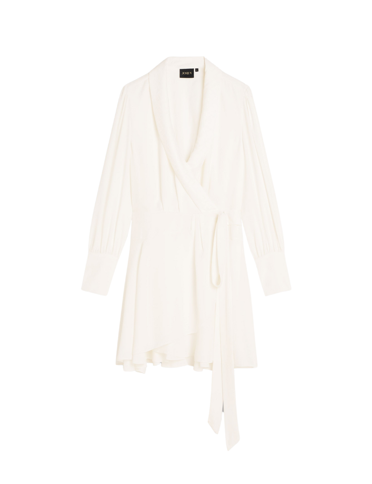 De JOSH V Tamaya jurk is gemaakt van flowy materiaal met een jacquard geweven V-logopatroon dat subtiel glanst. Met de strap kun je de witte wikkeljurk mooi tailleren. Om doorschijnen te voorkomen, is dit jurk gevoerd. Draag het witte tuniekje in combinatie met open heels of boots voor een elegante look.