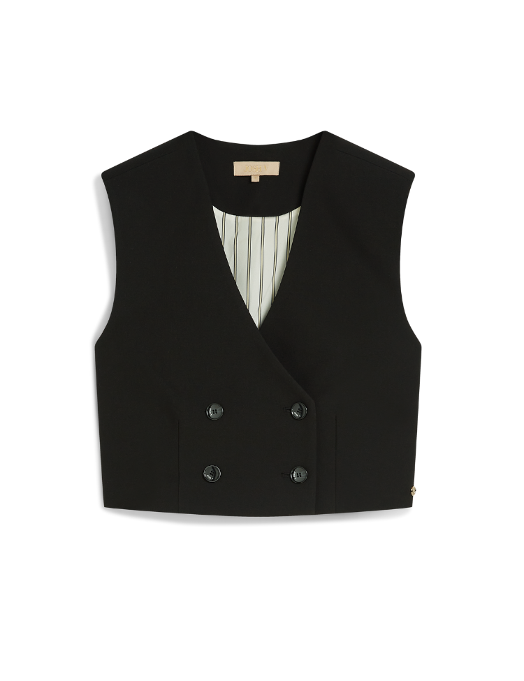 e Leva Top van Josh V in zwart is jouw go-to item voor een elegante, tijdloze én krachtige look. Deze gilet-top is uitgevoerd in een luxe stof met een tailored fit en een double-breasted knoopsluiting die zorgt voor een stijlvolle, gestructureerde uitstraling. De diep uitgesneden V-hals en cropped lengte geven het geheel een moderne en vrouwelijke twist.