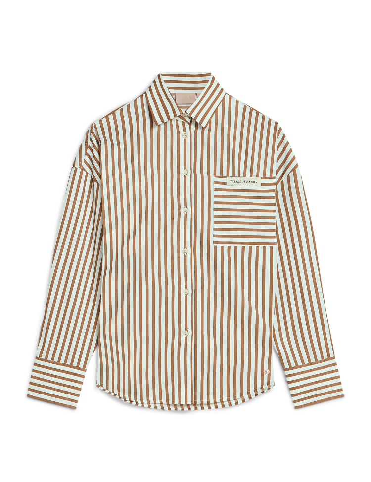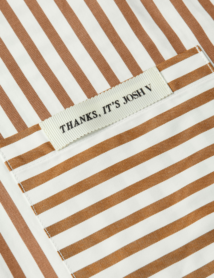 Het design is voorzien van een klassieke kraag, lange mouwen met manchetten en een borstzak met contrasterende streep en subtiele “THANKS, IT’S JOSH V” borduring. De rechte pasvorm en afgeronde zoom zorgen voor een flatterend silhouet – draag ‘m los, ingestopt of nonchalant open over een basic top.