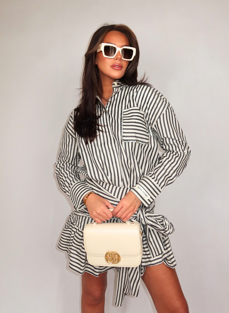 Deze gestreepte blouse en minirok van Josh V komen samen in één scherpe set. De blouse heeft een klassieke kraag, lange mouwen met manchetten, een borstzak met goudkleurige detaillering en een afgeronde zoom. De minirok is afgezet met een grote strik aan de zijkant en een geplooide afwerking. Het donkerblauwe streepdessin loopt door in beide stukken, wat de set direct een strakke, samengestelde uitstraling geeft.
