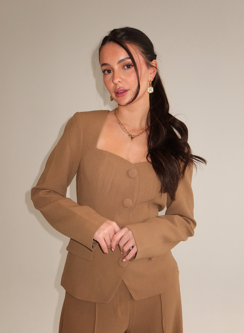 De Josh V Lise Top – Khaki is een chique, getailleerde top met een luxe blazerlook. Het ontwerp heeft een elegante vierkante halslijn en is afgewerkt met ton-sur-ton beklede knopen voor een verfijnde en minimalistische uitstraling. De subtiele figuurnaden zorgen voor een mooi aangesloten pasvorm, terwijl de kleine flapzakdetails een klassieke, sophisticated touch toevoegen. Aan de achterzijde sluit de top met een goudkleurige ritssluiting, wat de elegante look compleet maakt. Perfect voor zakelijke outfits, chique diners of stijlvolle kantoorlooks.