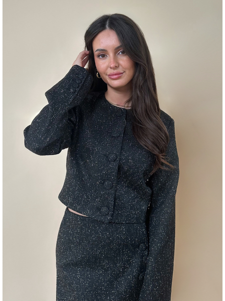 Deze zwarte minirok van Josh V is uitgevoerd in een geweven stof met subtiele gouden lurexdraden die door het materiaal lopen. De rok heeft een rechte pasvorm met een asymmetrische split aan de voorzijde, afgewerkt met een klein goudkleurig logo-detail. De tailleband zit comfortabel op je natuurlijke taille en de lengte valt net boven de knie. Het tweedachtige materiaal geeft de rok een verfijnde textuur die zowel zakelijk als feestelijk gedragen kan worden.
