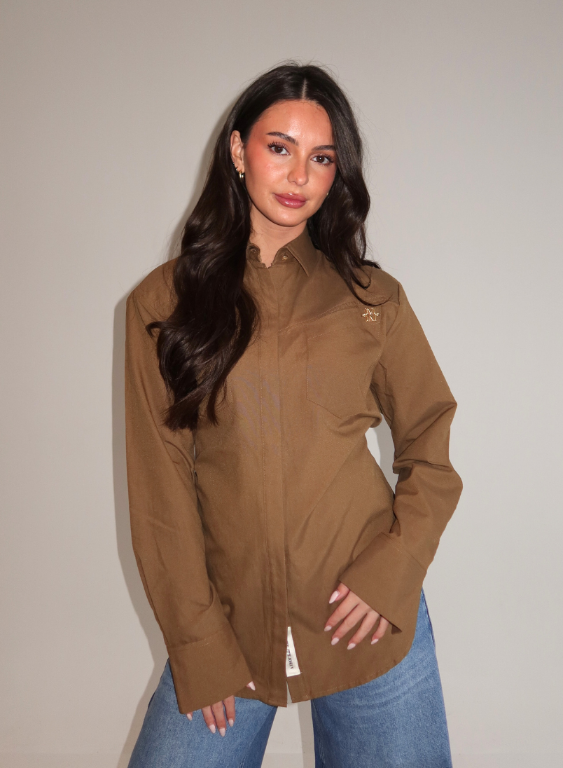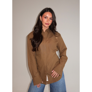 Deze olijfgroene blouse heeft een klassieke kraag en sluit met knopen aan de voorzijde. De lange mouwen en verlengde pasvorm zorgen voor een relaxte fit. Een goudkleurig logo bij de schouder voegt een verfijnd accent toe. De gladde stof met subtiele glans geeft de blouse een verzorgde uitstraling. De warme olijftint combineert makkelijk met verschillende kleuren en is geschikt voor zowel zakelijke als casual gelegenheden.