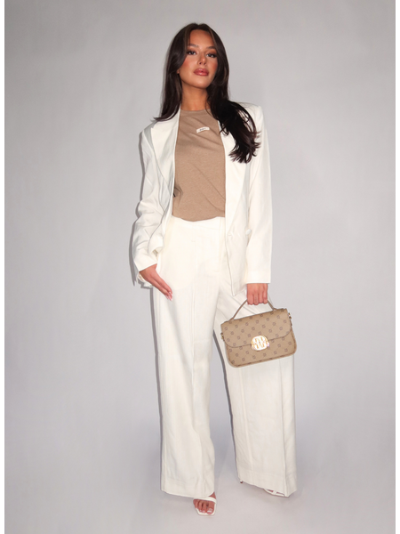 Kleur: Off white Sluiting: Double-breasted met stofknopen Zakken: Twee paspelzakken en een borstzakje Design: Brede revers, gestructureerde schouders, goudkleurig logo-label Lengte: Heuplang Artikelnummer: JV-2602-0304
