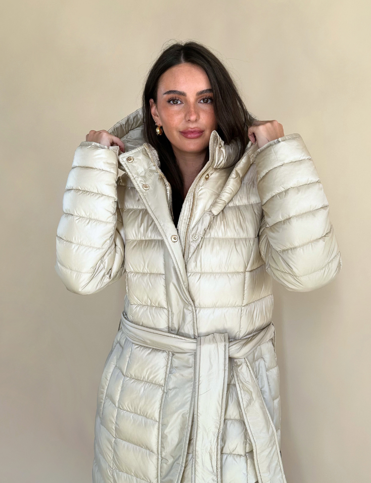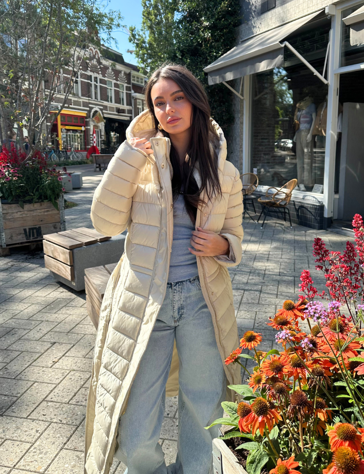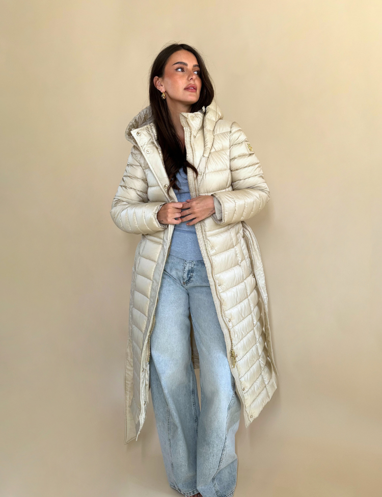 De JOSH V Mirsa jas in Light Beige is een elegante, gewatteerde lange jas die stijl en functionaliteit perfect combineert. De jas heeft een moderne rechte pasvorm met een ceintuur in de taille voor een vrouwelijke touch. Dankzij de hoogwaardige, lichtgewicht vulling biedt deze jas uitstekende warmte-isolatie zonder zwaar aan te voelen. De subtiele glans van de stof geeft de jas een luxe uitstraling, terwijl de opstaande kraag extra bescherming biedt tegen koude wind. Perfect voor de herfst- en wintermaanden.